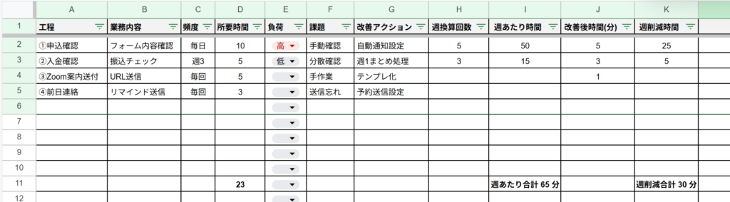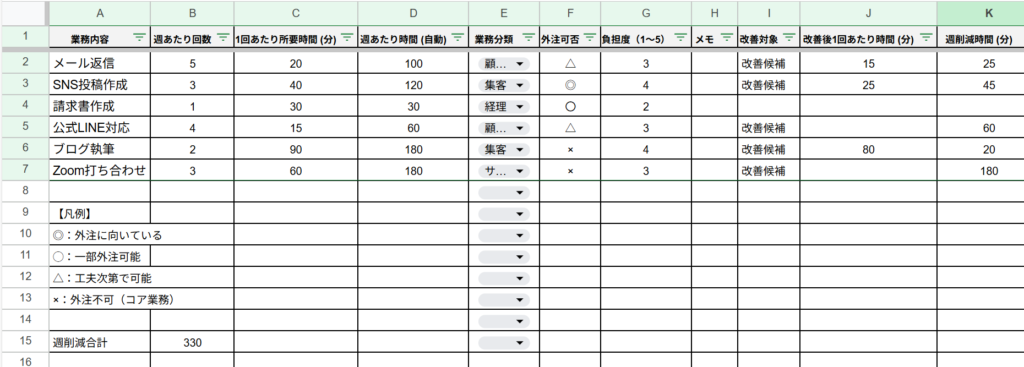 業務の棚卸しから分類、分析までを一つのシートで管理できるよう設計しています。
