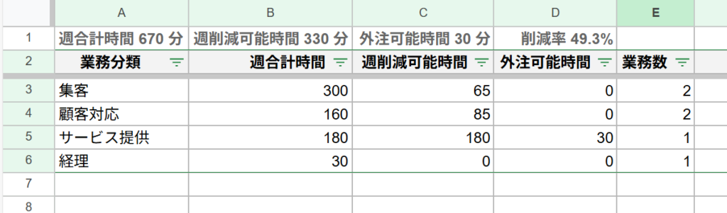 日々の業務を整理し、「何にどれくらい時間がかかっているか」を可視化するためのシートです。