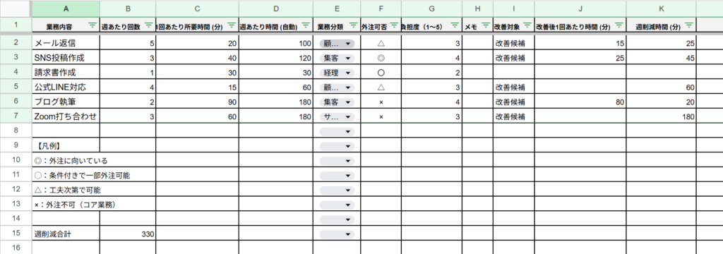 日々の業務を洗い出し、タスクごとの「重要度」と「外注可否」を整理するシートです。
